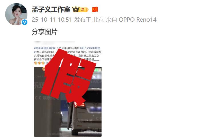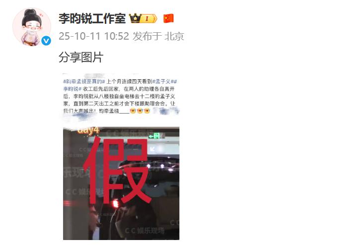 10月11日,针对八卦媒体爆料孟子义与李昀锐“连续多日同回公寓、过夜同居”的传闻,双方工作室火速同步辟谣,以鲜明态度否认恋情。