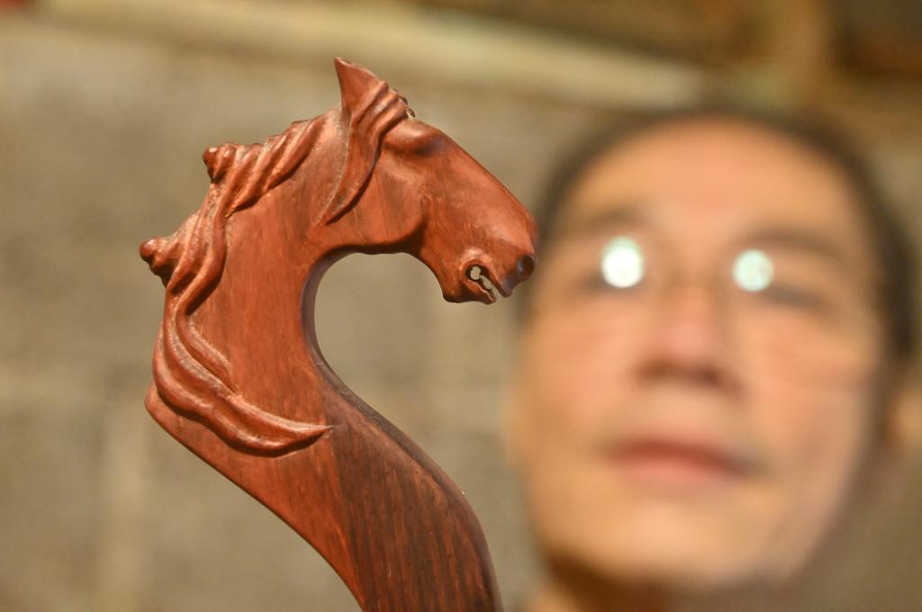 10月10日,黄一格在家中雕刻一把马骨胡的琴头。