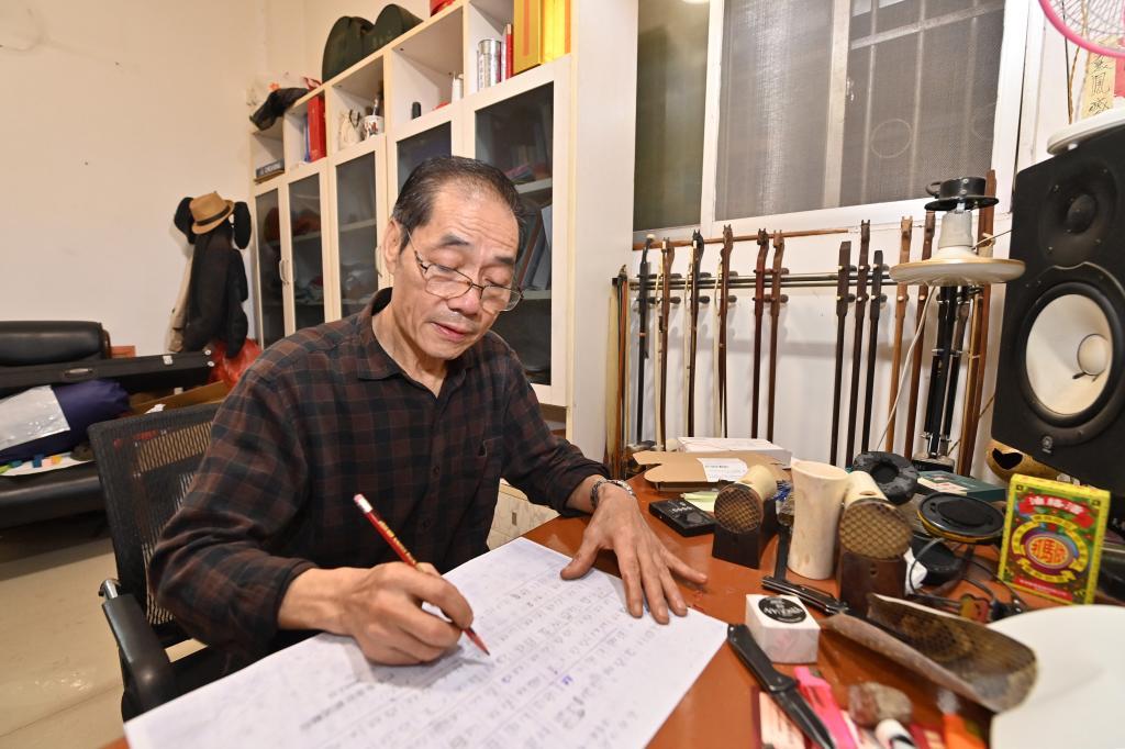 10月10日,黄一格在家中研究一首壮族马骨胡乐谱。