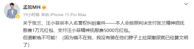 10月12日,麻六记前运营人员孟贺发文回应了汪小菲名誉维权胜诉,表示自己会按照判决支付张兰精神损抚慰费1万元红包、支付汪小菲精神抚慰费5000元红包。但其言辞激烈的表示道歉绝不可能:“错不在我。”并指责张兰在仲裁胜诉后诽谤其“贪污坑位费”,引发新一轮网暴。此前10月10日,汪小菲晒出北京互联网法院判决书:孟贺因在网络发表侵害汪小菲名誉权及隐私权的言论,被判公开道歉并支付精神损害抚慰金5000元。