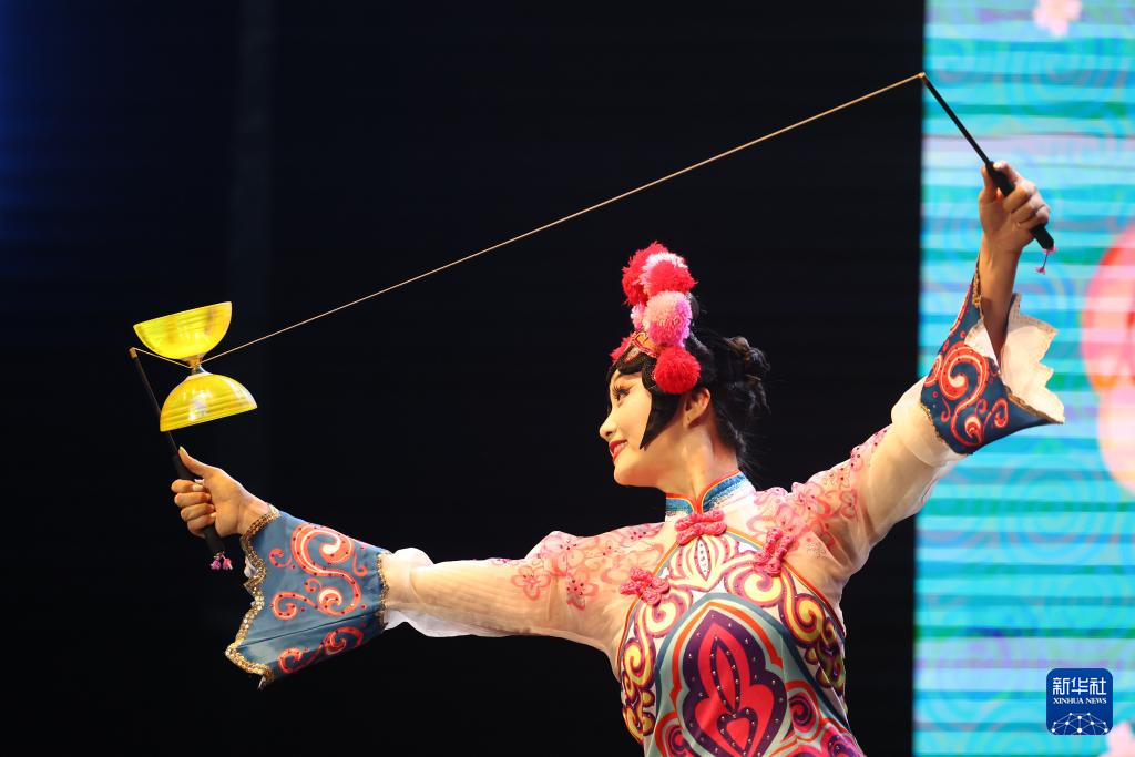 10月11日,在摩洛哥首都拉巴特举行的“天涯共此时”中秋晚会上,演员表演杂技《戏韵竹声》。