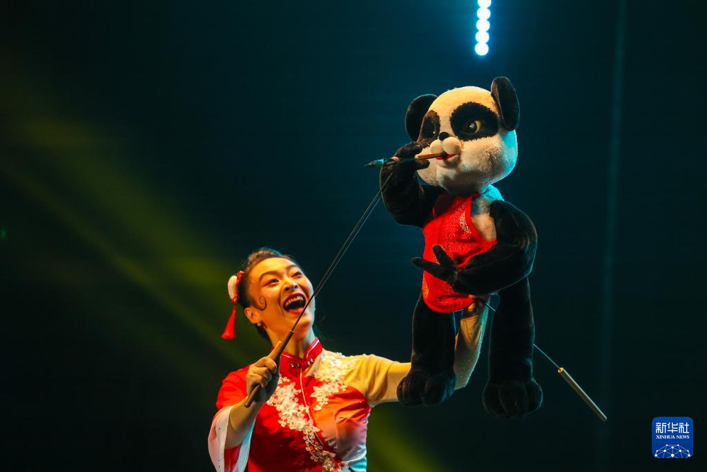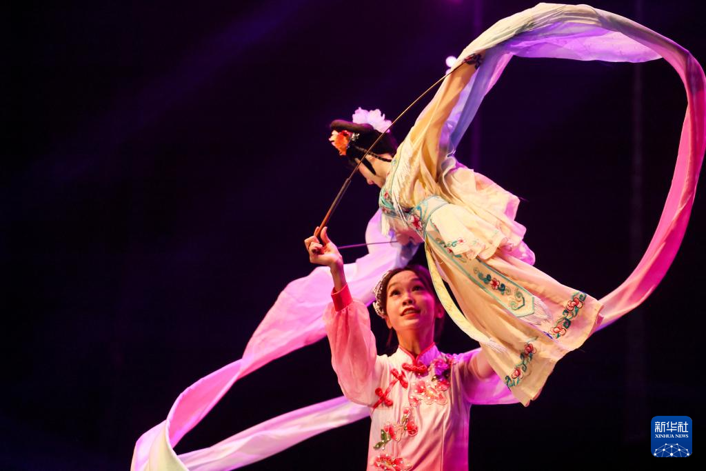 10月11日,在摩洛哥首都拉巴特举行的“天涯共此时”中秋晚会上,艺术家表演木偶长绸节目《秋月》。