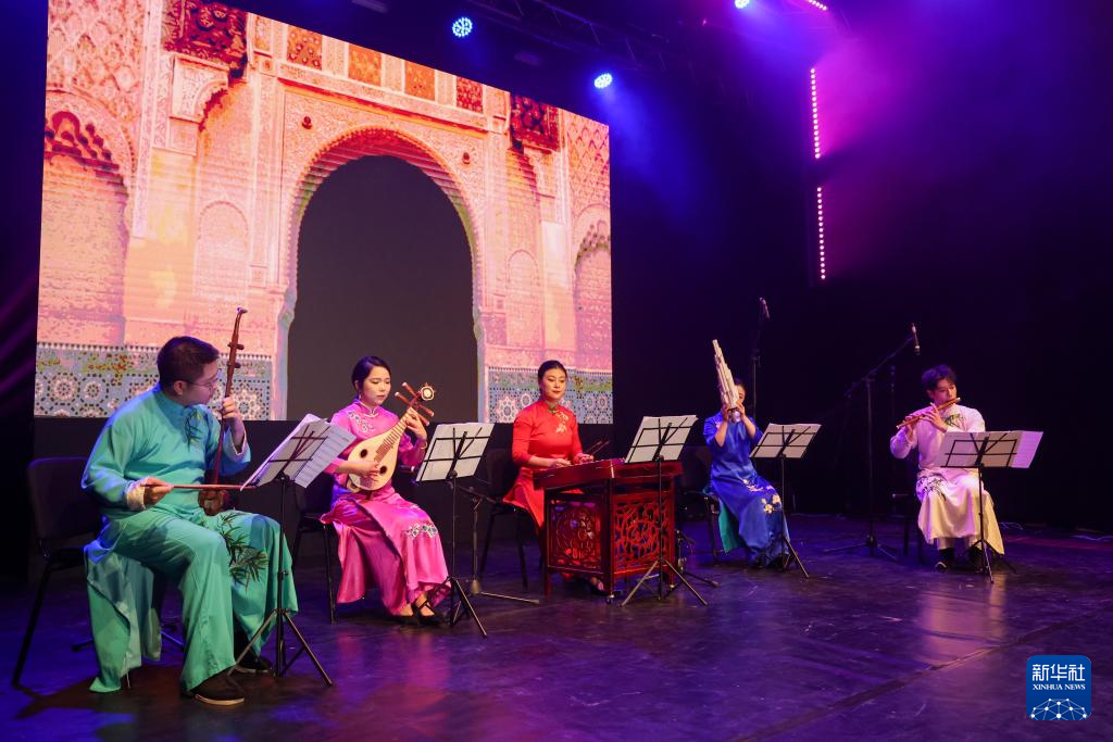 10月11日,在摩洛哥首都拉巴特举行的“天涯共此时”中秋晚会上,民乐艺术家演奏摩洛哥乐曲《爱的使者》。