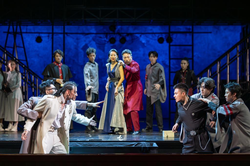 开幕剧《哈姆雷特》力求融合东方意蕴和现代审美,融入击剑、舞蹈、弹唱等表演元素,以悬梯、滑杆、灯具、服装箱等营造出“废弃剧场”的空间效果,展现“选择”这一贴近现代人生活的核心主题。