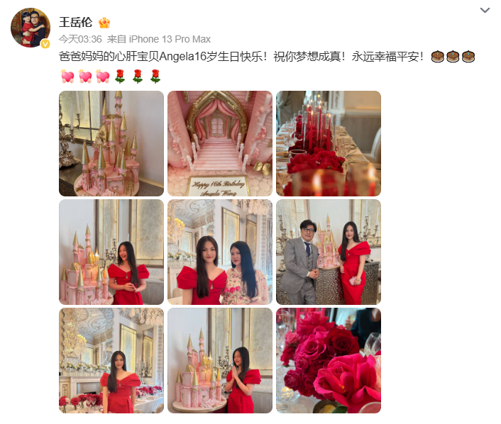 李湘首发组图后,王岳伦与王诗龄也陆续分享了生日聚会照片。王岳伦还写道:“爸爸妈妈的心肝宝贝Angela16岁生日快乐!祝你梦想成真!永远幸福平安!”