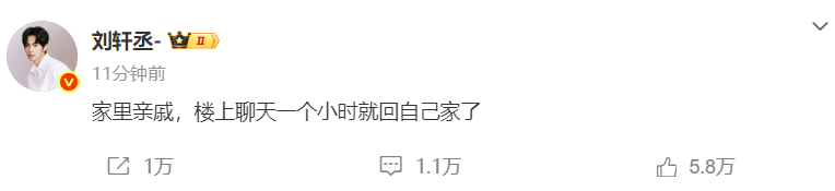 随后,刘轩丞发文回应:“家里亲戚,楼上聊天一个小时就回自己家了。”
