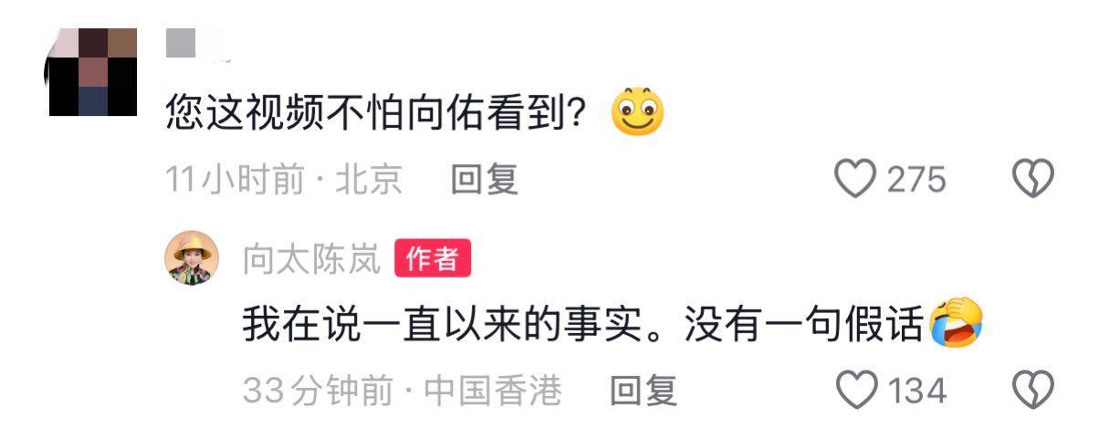 这些留言都得到了向太的点赞,可见她一直在关注网友对这条视频的反应。看到有人在评论区问“不怕向佑看到这个视频吗”,向太直接回复道:我在说一直以来的事实,没有一句假话。
