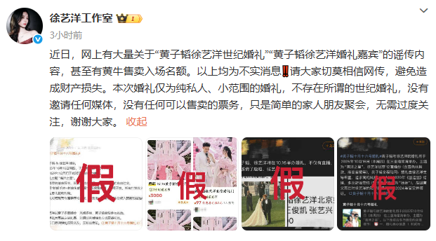 近日,网上有大量关于“黄子韬徐艺洋世纪婚礼”“黄子韬徐艺洋婚礼嘉宾”的谣传内容,甚至有黄牛售卖入场名额。以上均为不实消息 请大家切莫相信网传,避免造成财产损失。本次婚礼仅为纯私人、小范围的婚礼,不存在所谓的世纪婚礼,没有邀请任何媒体,没有任何可以售卖的票务,只是简单的家人朋友聚会,无需过度关注,谢谢大家。