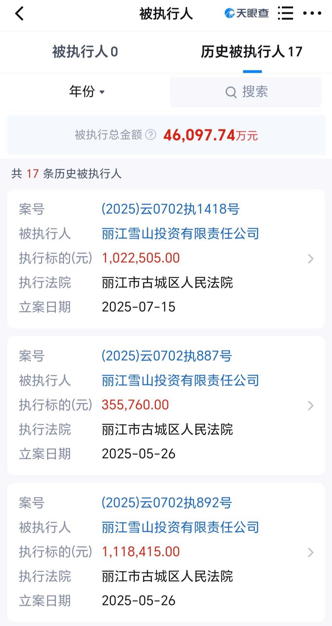 ▲丽江雪山投资有限责任公司被执行总金额超4.6亿