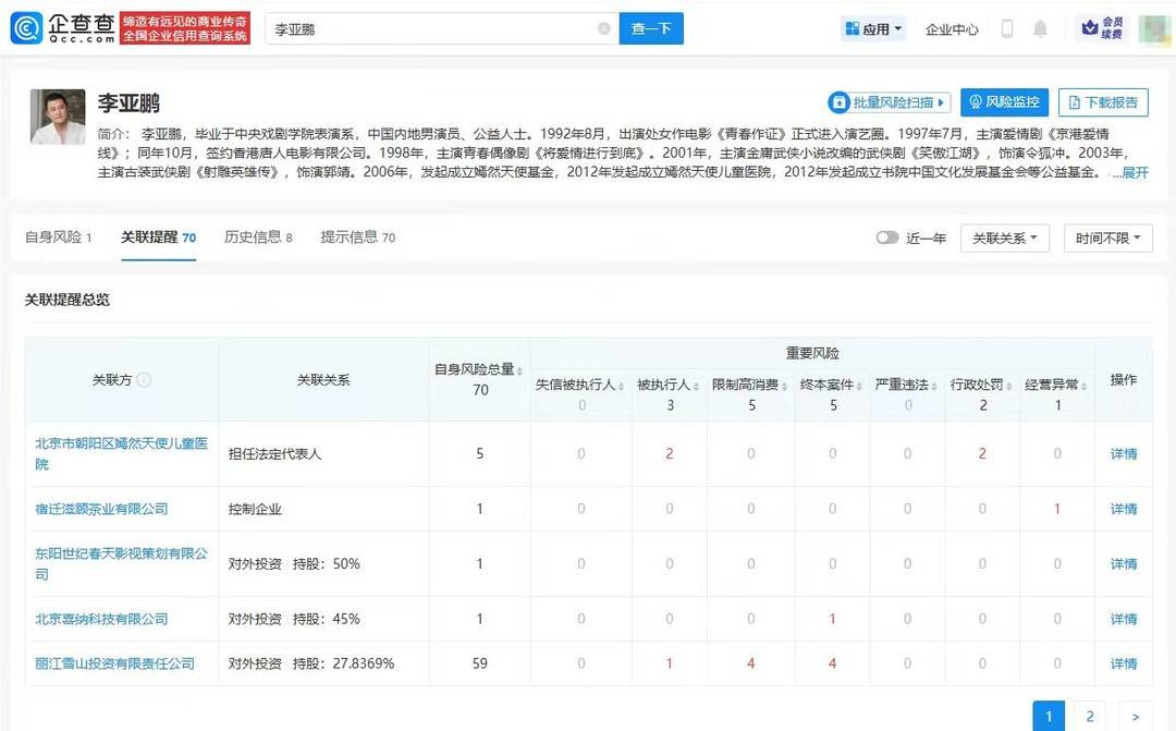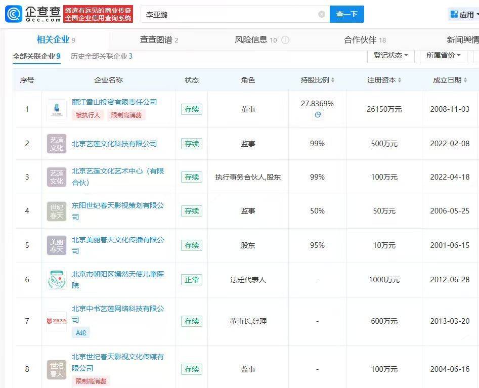 企查查APP显示,李亚鹏目前共计关联丽江雪山投资有限责任公司、北京艺莲文化科技有限公司、北京艺莲文化艺术中心(有限合伙)等9家企业。其中,北京市朝阳区嫣然天使儿童医院涉两条被执行人信息,北京喜纳科技有限公司涉及一起终本案件,丽江雪山投资有限责任公司关联有1条被执行人信息、4条限制高消费信息、4条终本案件信息。