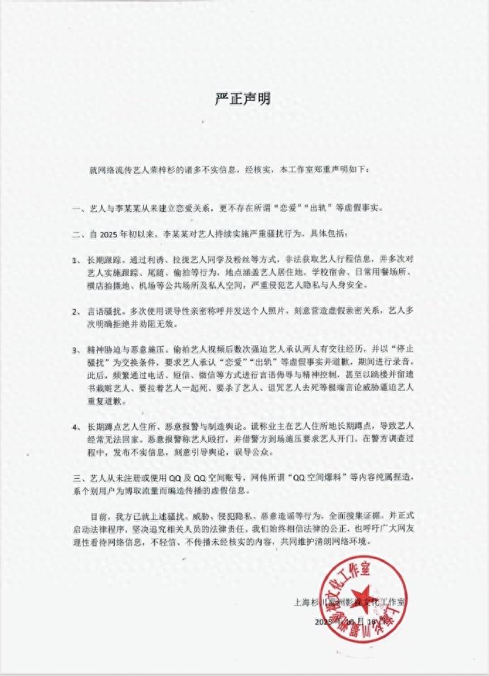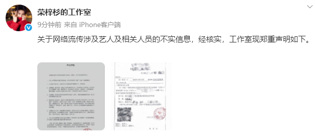 10月16日,荣梓杉方发布声明辟谣恋爱出轨。