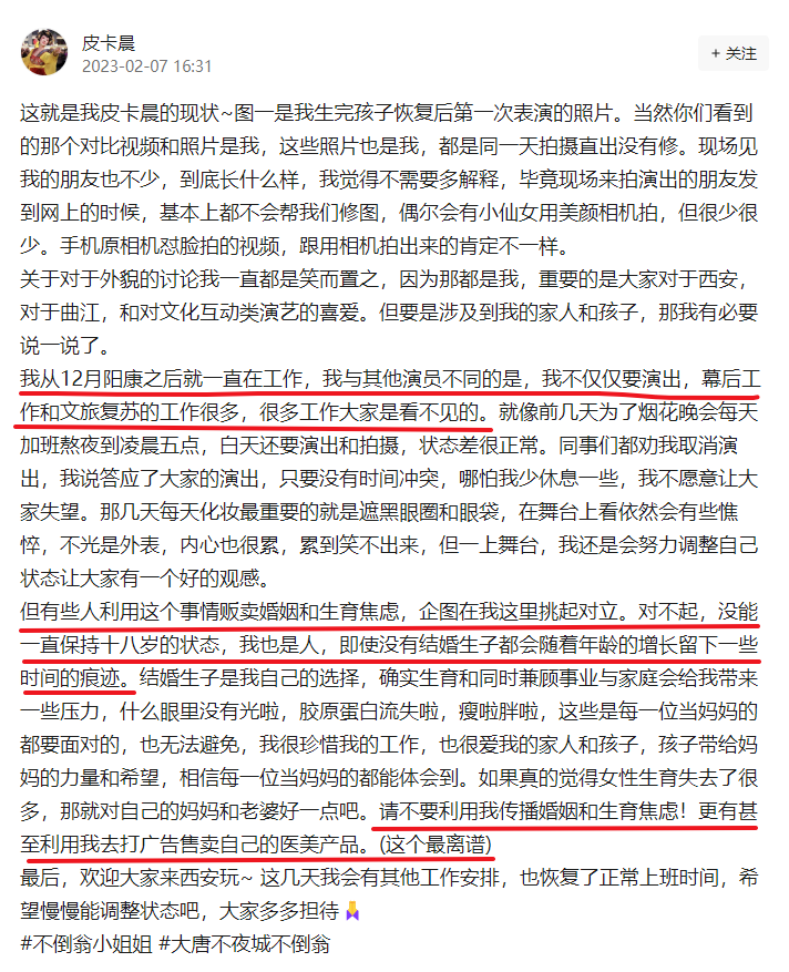在评论区,她再次重申:“评论外貌我不会在乎,这也是每个人的权利,但不要利用我传播婚姻和生育焦虑!我不给一些不怀好意之人当挡箭牌!孩子都快两岁了,这个锅她不背。”
