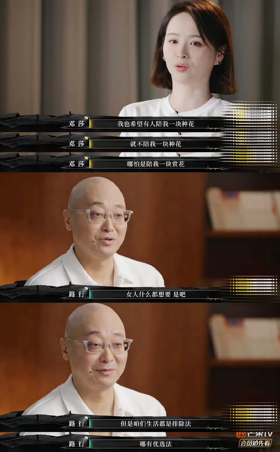 邓莎在节目中提到,两人因为怀孕选择结婚,近几年是“半分居状态”。平时的相处模式是有事儿说事,有时候一个星期都没有一条短信。她曾在15日节目放出的预告片里坦言,自己面对的是“丧偶式婚姻”。