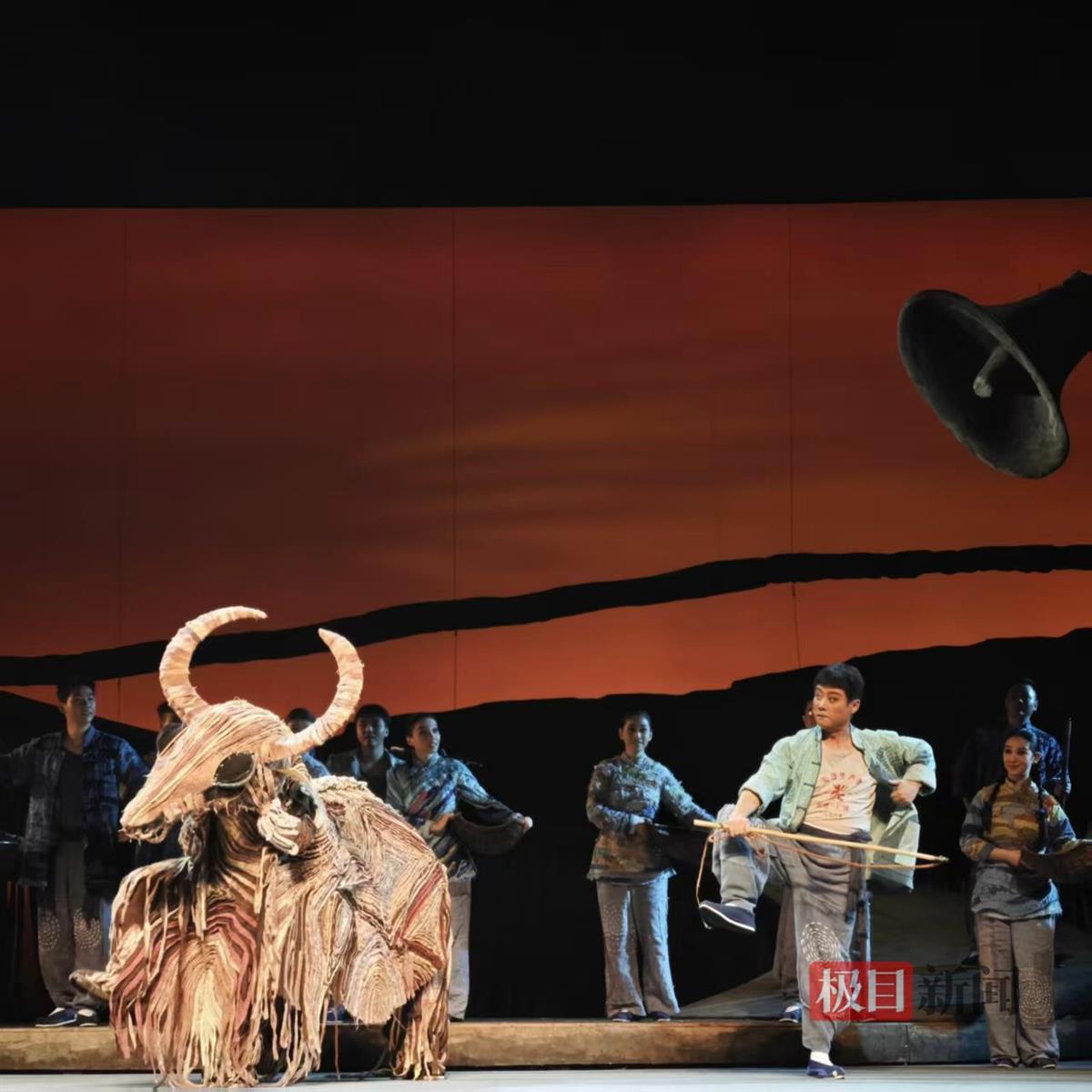 《田耕牛本传》总导演何艺光强调,该剧在坚守楚剧传统表演根基的同时,大胆融入西洋管弦乐、电声乐队等现代音乐元素,以增强时代感与戏剧张力。舞台视觉采用大色调、印象派风格的美术设计,营造出浓郁的乡土气息与轻喜剧氛围。剧中“牛”的形象由两人协同扮演,既保留了人偶化的传统戏曲手法,又赋予其人性化的互动与唱段,成为全剧一大亮点。