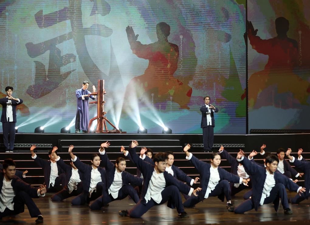 这是10月16日晚,佛山多个武术队在第13届中国国际民间艺术节开幕式文艺晚会上,带来武术《功夫佛山》。新华社记者黄国保 摄