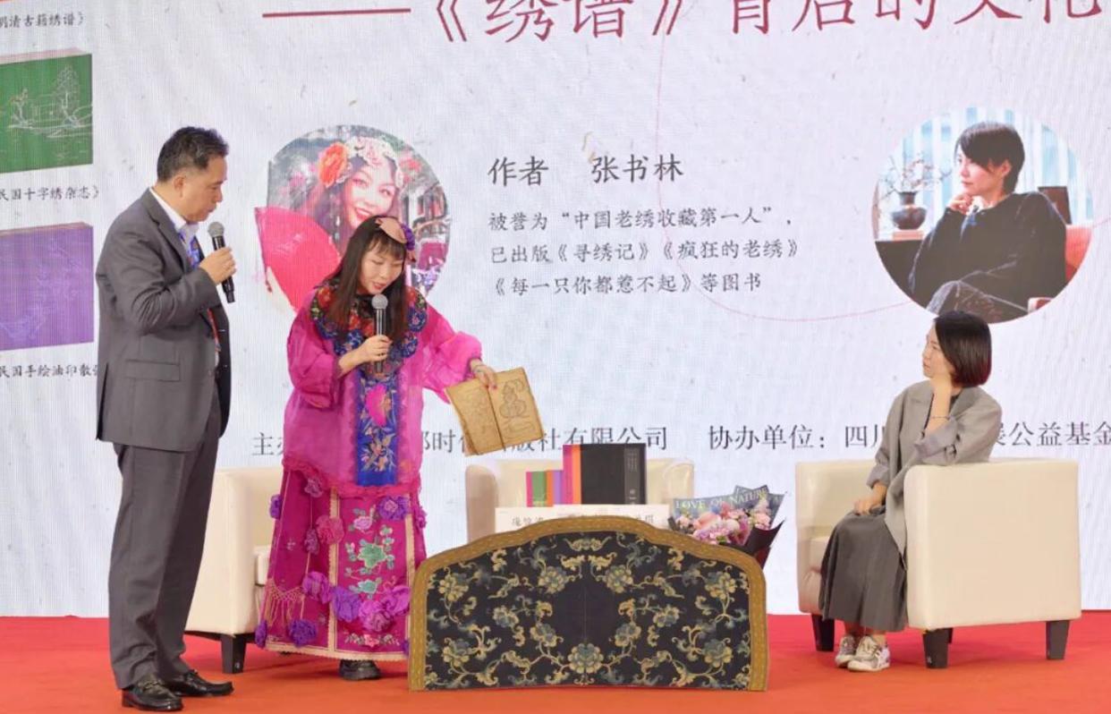 作为本届天府书展推出的重点图书项目之一,《绣谱》历时五年编撰而成,收录珍贵绣样1700余幅,涵盖蜀绣、湘绣、苏绣、粤绣四大名绣体系,填补了传统工艺文献整理的空白。该书已入选四川省2023—2025年重点图书出版规划,并获2024年四川出版发展公益基金资助。活动现场,随着红绸缓缓揭开,《绣谱》三卷典藏之作首次完整呈现于公众面前。