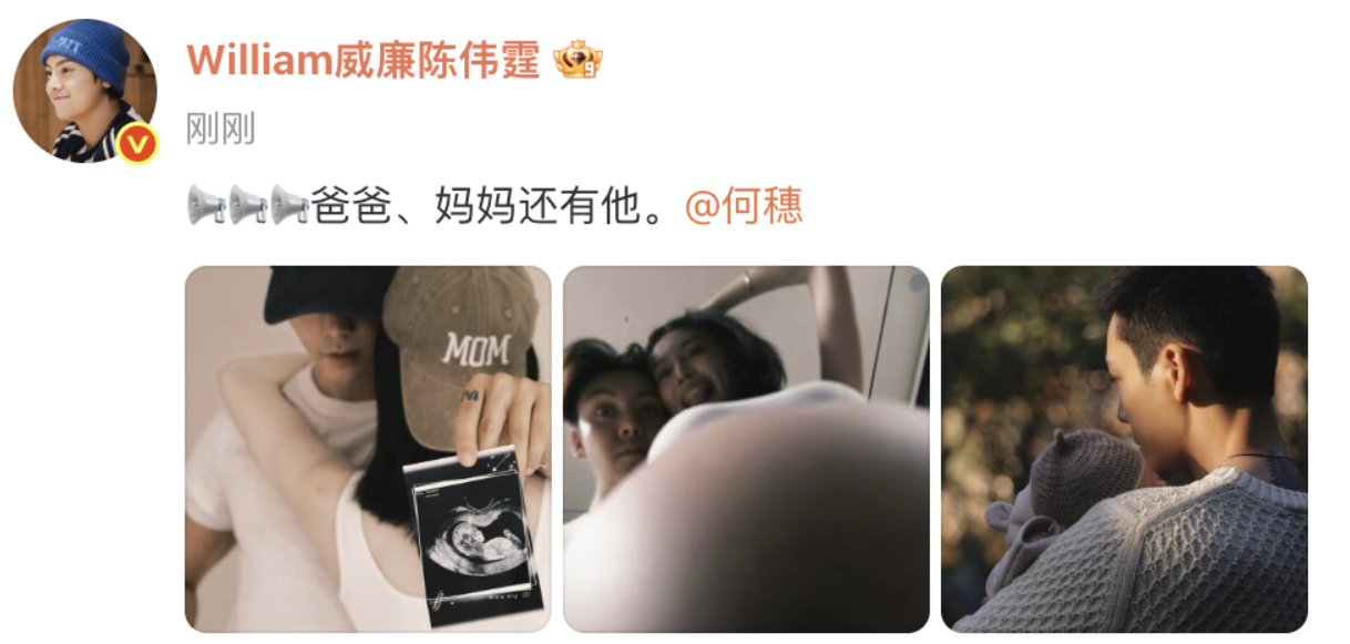 18日上午10:00,陈伟霆、何穗官宣生子,两人发“爸爸,妈妈,还有他。”的微博并艾特对方,轻松爆掉社交平台。