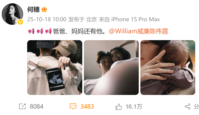 10月18日上午,陈伟霆、何穗晒出B超照、孕期照、和儿子的合照官宣得子,两人还配文:“爸爸,妈妈,还有他。”并提及了对方的账号。