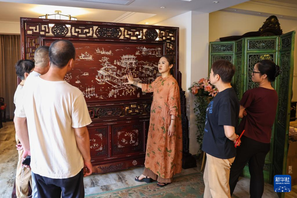 10月15日,胡蓉(右三)在孔浦街道怡江社区的非遗工作室为居民介绍骨木镶嵌技艺。