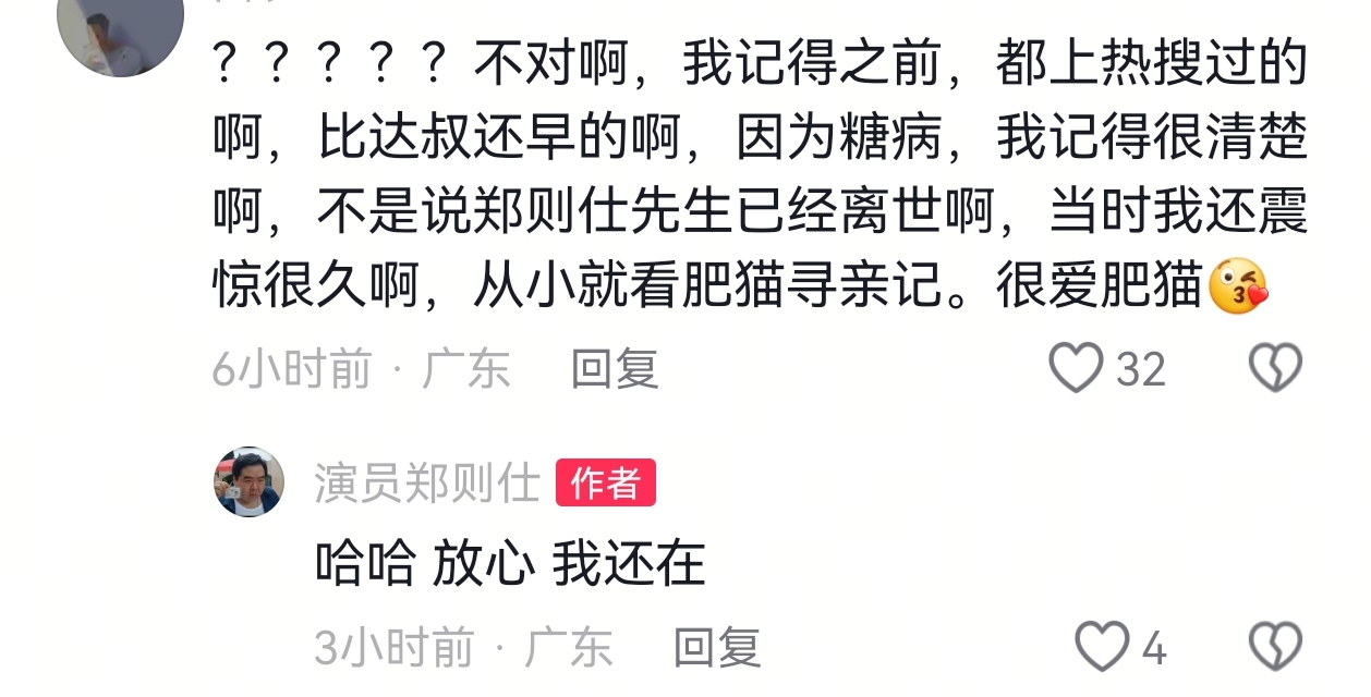 评论区有网友称,印象中郑则仕已经因为糖尿病离世,郑则仕大方回复道:“哈哈,放心,我还在。”
