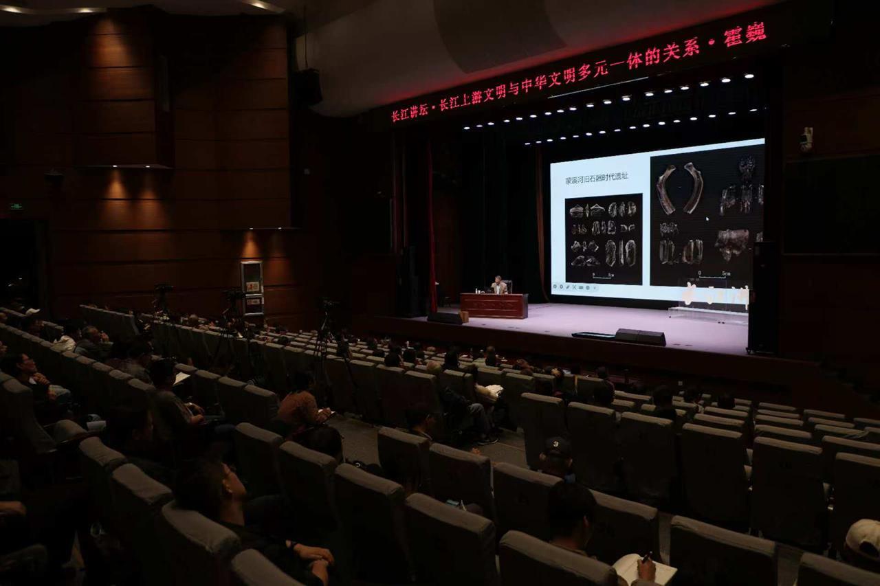 讲座伊始,霍巍教授以长江上游的地理空间为锚点,勾勒出这片土地的文明底色。“万里长江发源于青藏高原,在巴蜀大地积蓄力量、孕育文明,这里是地理单元的关键节点,更是中华文明多元一体格局的‘活化石’。”他指出,长江上游以四川盆地为中心,覆盖今成都、重庆、云南北部及贵州东部等地,独特的盆地地形与江河网络,既催生了相对独立的文化生态,又为文明交流提供了天然廊道。