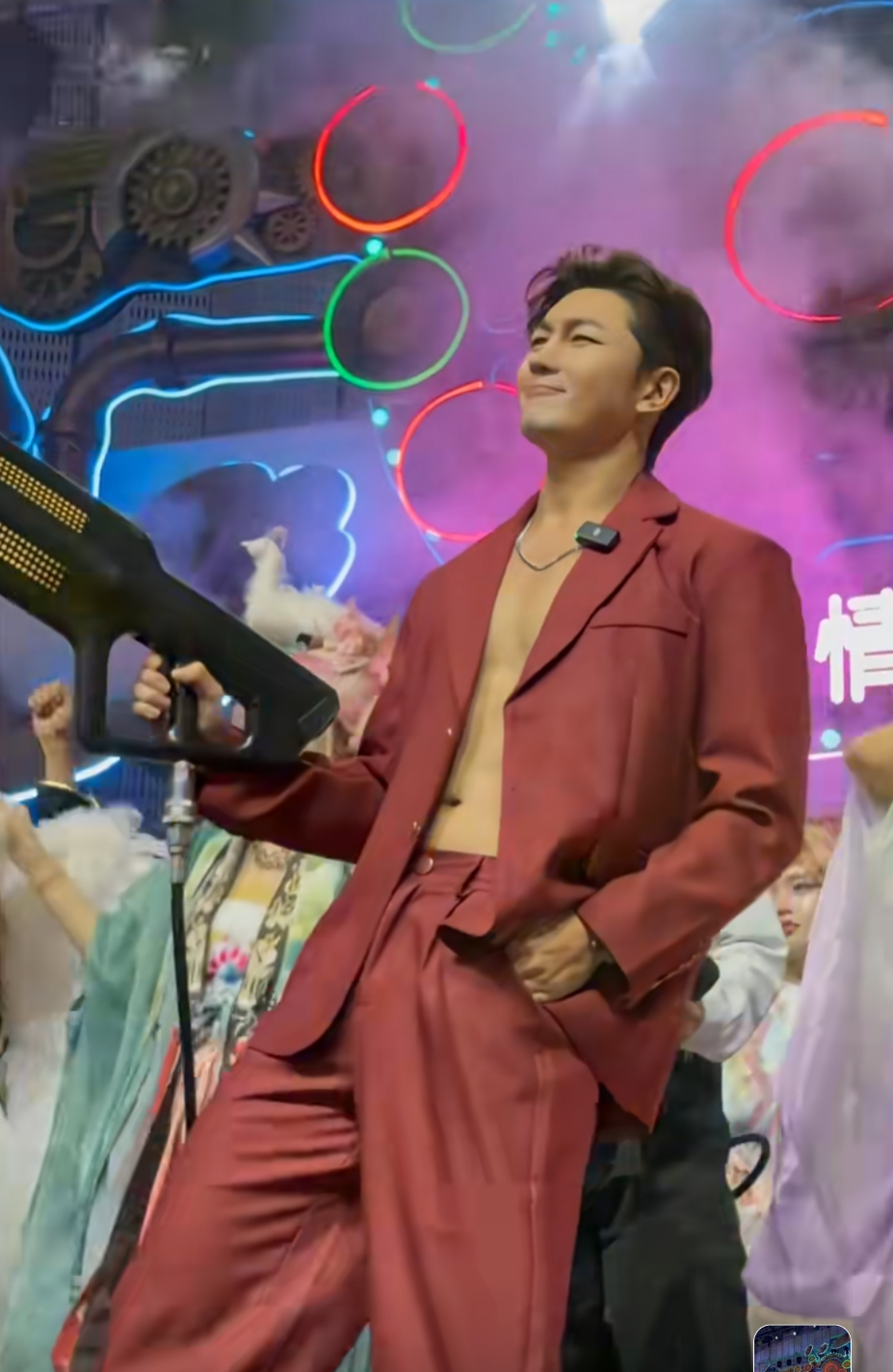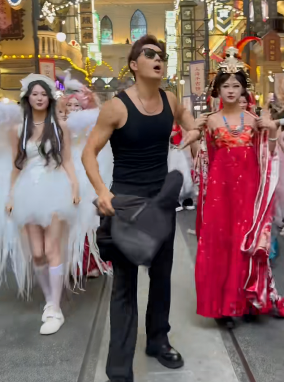 他在景区脱衣秀肌肉,和其他演职人员一起共舞。