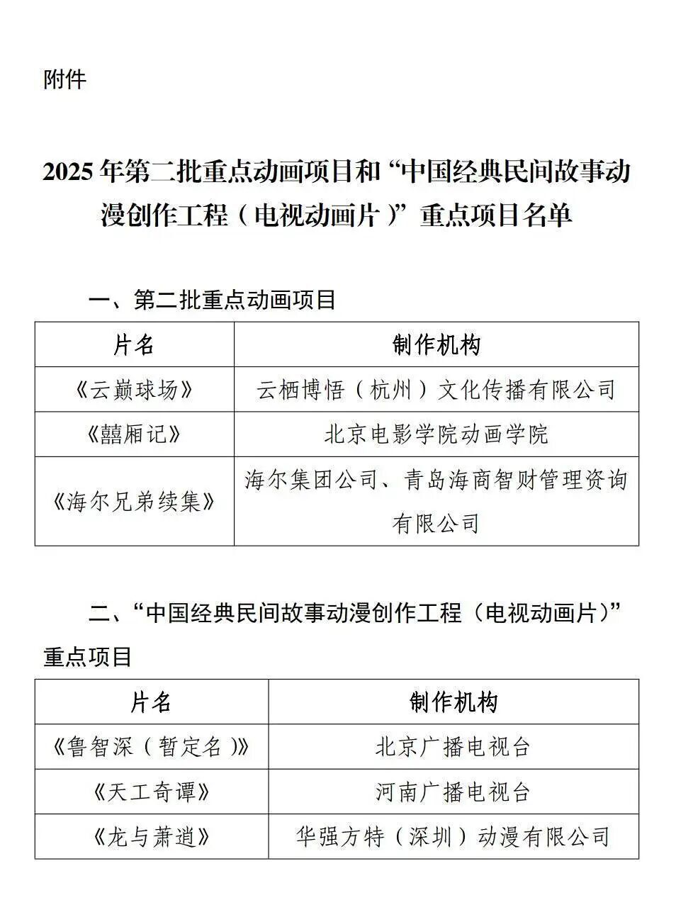 近年来,全国动画行业认真学习贯彻习近平新时代中国特色社会主义思想特别是习近平文化思想,坚定文化自信,坚持价值引领,大力推动动画精品创作,取得良好成效。近期,经各省级广播电视行政部门和中央广播电视总台办公厅推荐,广电总局组织专家评审,评出《云巅球场》《囍厢记》《海尔兄弟续集》等3个项目为2025年第二批重点动画项目,《鲁智深(暂定名)》《天工奇谭》《龙与萧逍》等3个项目为“中国经典民间故事动漫创作工程(电视动画片)”重点项目,现予以公示。