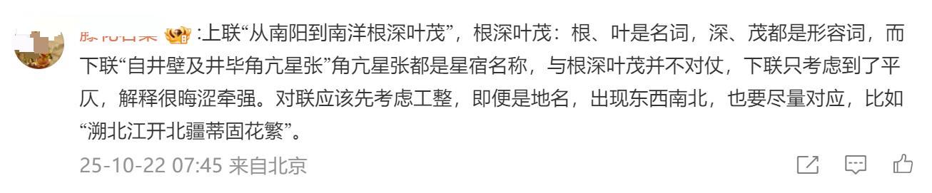 10月22日,新闻记者上网搜索发现,网友对“自井壁及井毕角亢星张”十字下联评论不一。不少网友给予高度好评,但也有很多网友直呼“看不懂”“深奥难懂”。