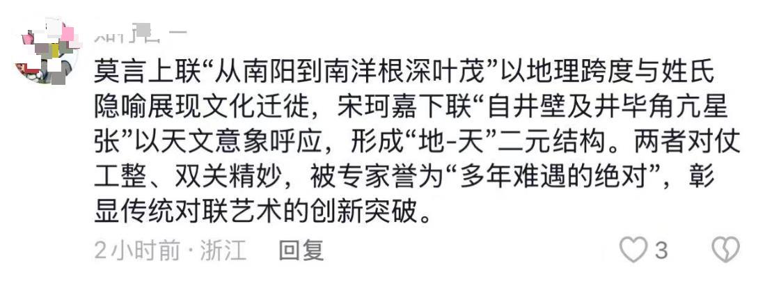 今年6月,诺贝尔文学奖获得者莫言在广东惠州惠阳区秋长街道周田村,面对百年客家围屋碧滟楼,有感于叶氏家族从中原南阳迁徙至海外南洋的壮阔历史,挥笔写下十字上联:从南阳到南洋根深叶茂。此联以“南阳/南洋”的同音双关暗喻地理跨越,“根深叶茂”既指家族繁盛。由此莫言发出“向天下文友敬求下联”之邀,将评出一等奖1名,奖金10万元。因“一字值万元”,“莫言游惠州,喊你对下联”活动也一度登上热搜。