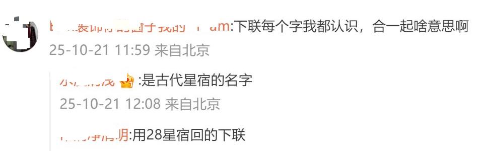 另一位多次在业界赛事获奖的女联友说,对联创作比较讲究用典,甚至用一些古文字,她揣测这次的获奖者独辟蹊径“用上了天上的星宿”,可能是想“显得比较高雅古典”。“对于几个星宿的名字被他排列组合的还是有点意思,并且那个平仄对仗都对上了。”她点赞道。但是,她对作者选取“井壁”这个物象表示不解:“故乡那么多的地方,为什么要选取井壁这个物象?是说在家只能坐井观天,看不到更广阔的天地吗?”