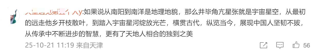 有报道显示,欧阳江河深入解读了这副对联的精妙:除两联对仗极为工整之外,莫言的上联“根深叶茂”暗藏家族迁徙史与中华“中原”文脉,而“根”向大地深处的探寻,恰与宋珂嘉下联中的“井”意象遥相呼应。他特别指出,下联“角亢星张”四字,皆取自中国古代二十八星宿体系。这巧妙地将苏东坡挖井的历史典故与“羽化登仙”、魂归星海的文化意象相连,使对联意境从厚重大地升至璀璨苍穹,完成了地域人文与浩瀚时空的宏大对话。