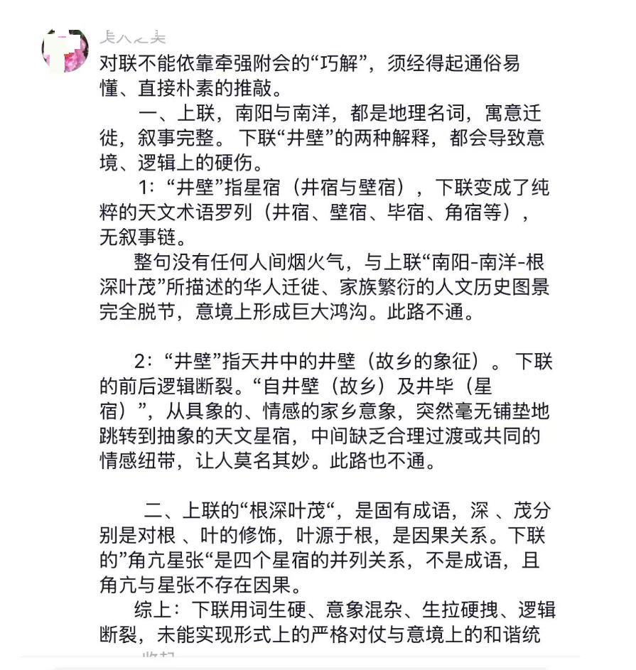 一位不愿具名的楹联界大咖称自己从朋友圈也关注到这件事以及网友的反应,“‘自井壁及井毕角亢星张’,看到这个下联,我跟不少网友一样,第一印象就是有点‘蒙圈’,不好懂”。他认为,好的对联作品,要讲求意象和物象的意料之外、情理之中,前后关联要得当,逻辑关系须紧密。在他看来,下联中的“井壁”,尤其是“井毕”,有硬凑之嫌。他还点评了其他获奖作品,认为也各有瑕疵,未能反映出中国楹联界的真正水平。