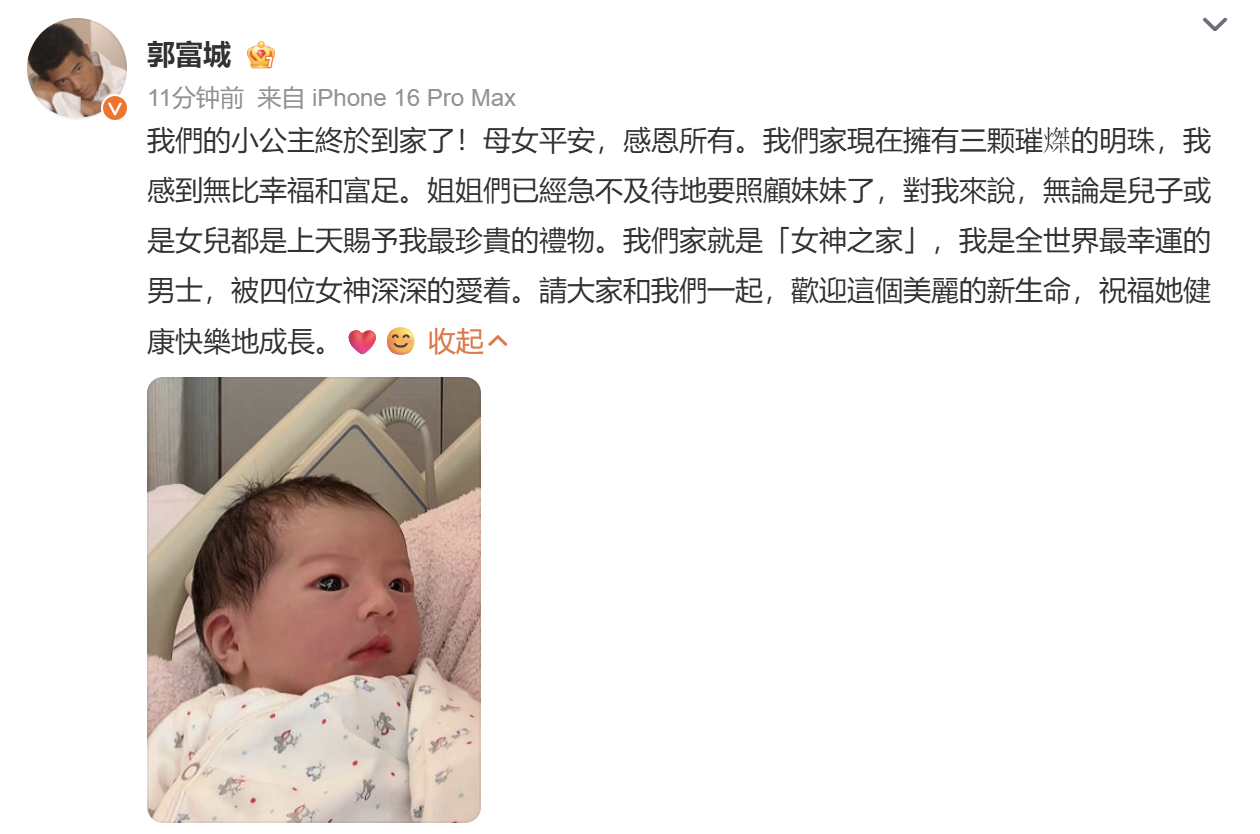 我們的小公主終於到家了!母女平安,感恩所有。我們家現在擁有三颗璀𤌴的明珠,我感到無比幸福和富足。姐姐們已經急不及待地要照顧妹妹了,對我來說,無論是兒子或是女兒都是上天賜予我最珍貴的禮物。我們家就是「女神之家」,我是全世界最幸運的男士,被四位女神深深的愛着。請大家和我們一起,歡迎這個美麗的新生命,祝福她健康快樂地成長。