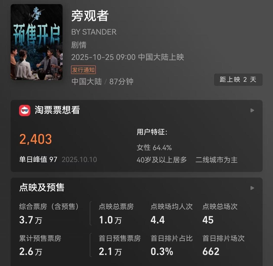 10月23日,电影《旁观者》发文宣布撤档:“经慎重考虑,电影《旁观者》将取消原定10月25日的公映计划,延期上映。我们向所有期待本片的观众、合作伙伴及院线同仁致以诚挚的歉意。”