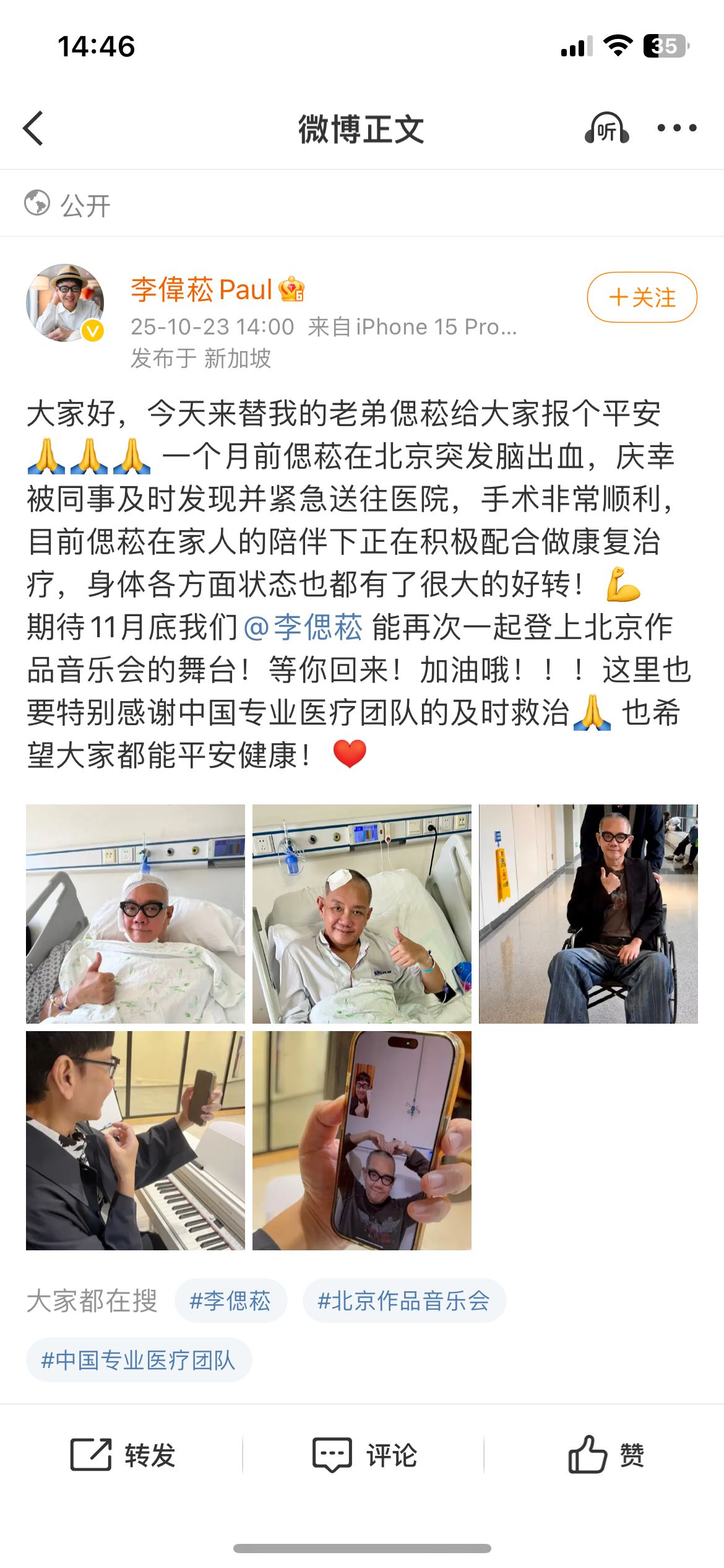 李伟菘的报平安微博中还提到,两人将在11月底在北京举行音乐会,不少网友及歌迷在其微博下留言:“请早点康复,期待音乐会上见!”
