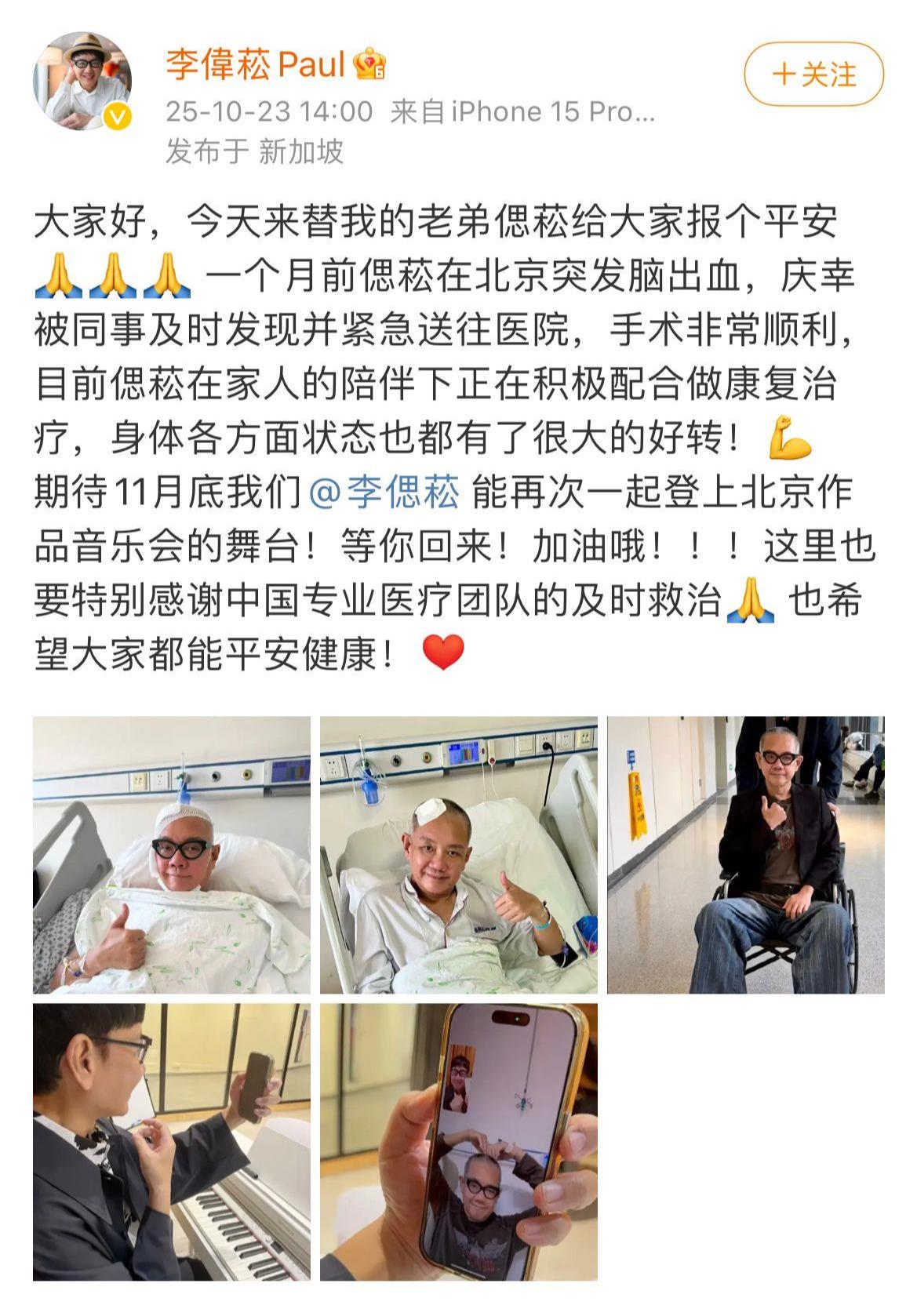 10月23日下午2:00,李伟菘发布微博提到,著名音乐人李偲菘一个月前在北京突发脑出血,庆幸被同事及时发现并紧急送往医院,经北京专业医疗团队及时救治身体有了好转。李伟菘在微博中万分感谢“中国专业医疗团队的及时救治”,更祝福所有人平安健康。