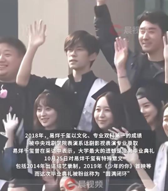 2018年,易烊千玺以文化、专业双科第一的成绩被中央戏剧学院表演系话剧影视表演专业录取,易烊千玺曾在采访中表示,大学最大的遗憾是没有毕业典礼,这次毕业典礼也被粉丝称为“圆满闭环”。