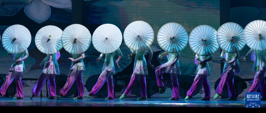 10月25日,在北京二七剧场举行的“艺苑撷英——2025年全国优秀青年艺术人才展演”上,德州市杂技团演员表演杂技《荷塘月色——蹬伞》。新华社记者 才扬 摄