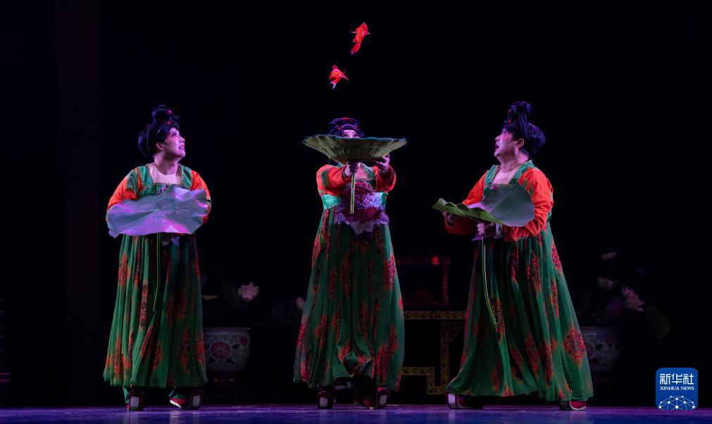 10月25日,在北京二七剧场举行的“艺苑撷英——2025年全国优秀青年艺术人才展演”上,天津市杂技团演员表演滑稽《唐宫·鱼韵》。新华社记者 才扬 摄