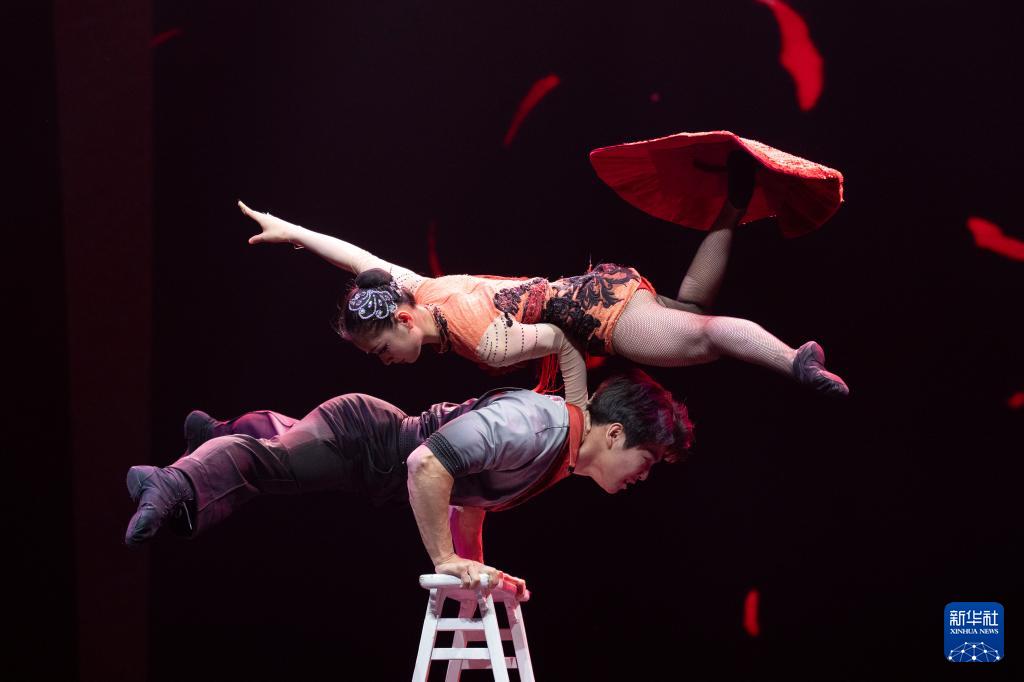 10月25日,在北京二七剧场举行的“艺苑撷英——2025年全国优秀青年艺术人才展演”上,广州市杂技艺术剧院有限责任公司演员表演杂技《炽爱情舞——双人转毯》。新华社记者 才扬 摄