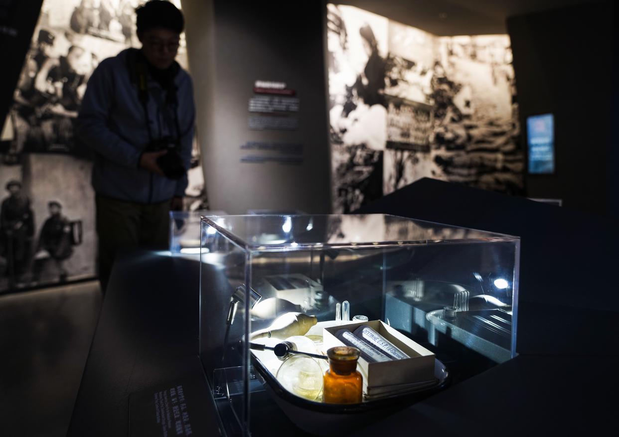 10月25日,参观者在中国红十字会救护总队贵阳图云关抗战纪念馆内观看展品。新华社记者 周佳谊 摄