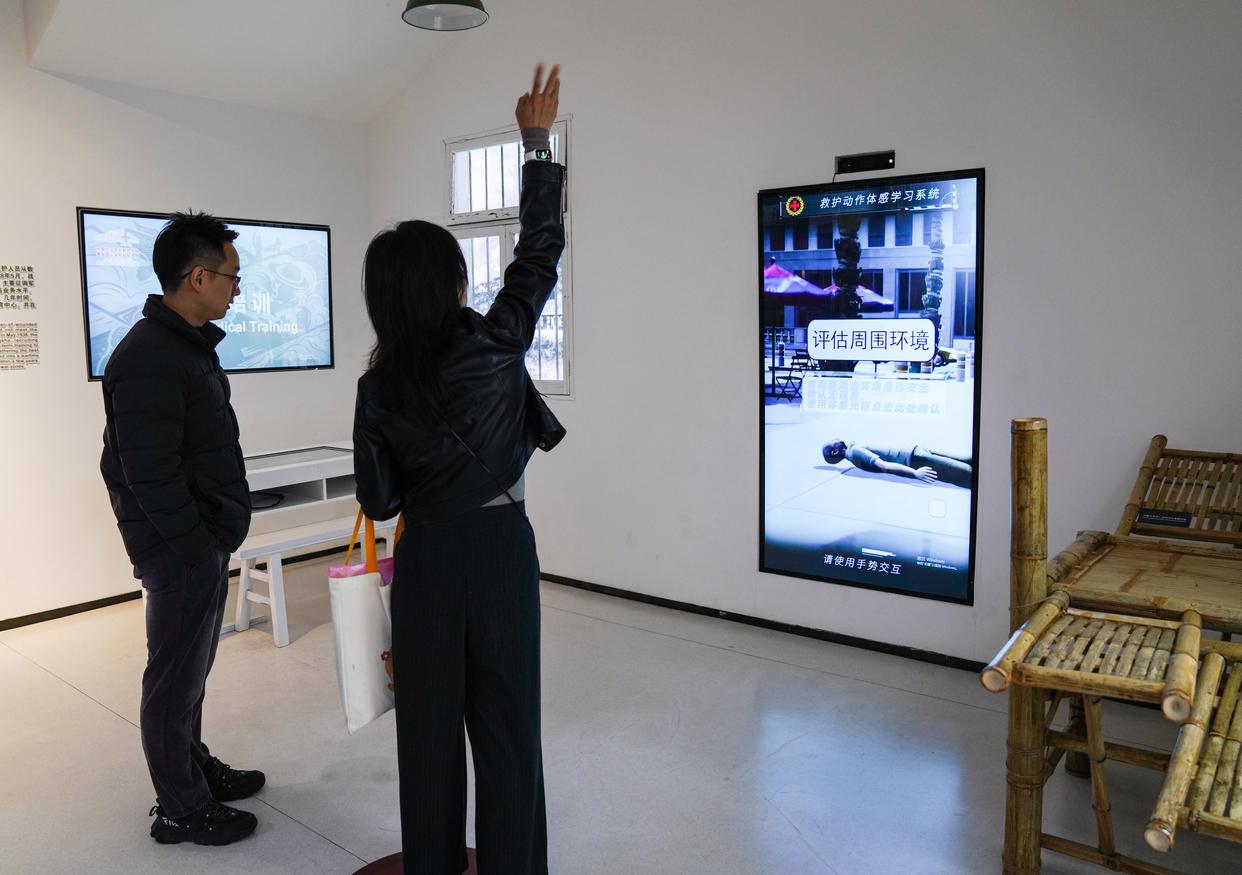 10月25日,参观者在中国红十字会救护总队贵阳图云关抗战纪念馆内体验救护动作体感学习系统。新华社记者 周佳谊 摄