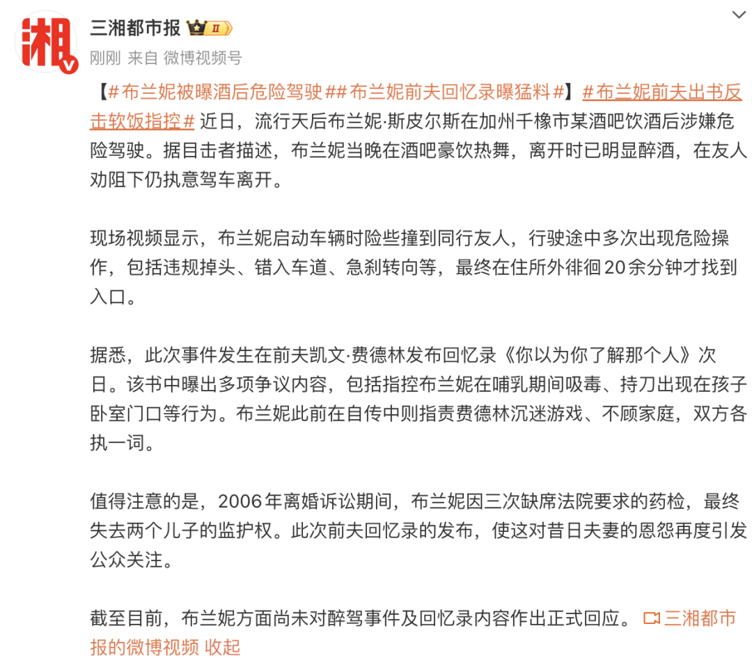 截至目前,布兰妮方面尚未对醉驾事件及回忆录内容作出正式回应。