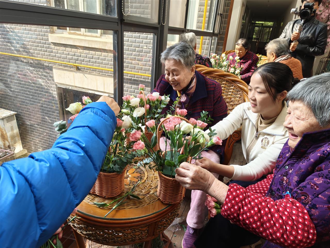 最温馨的环节莫过于“花香伴重阳”插花活动。馆员与文旅志愿者化身“贴心助手”,与老人们一对一协作。修剪花枝、构思搭配……在欢声笑语中,象征着吉祥的各色康乃馨在老人们手中被巧妙组合,变成一个个独具匠心的花篮。
