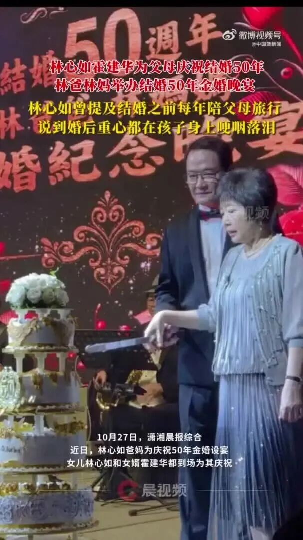 10月26日,林心如与霍建华在台北一酒店设宴,庆祝父母结婚50周年(金婚)。现场以温馨风格布置,父母登台切蛋糕,林心如身穿深蓝色礼服,霍建华则着浅蓝色T恤低调陪同。