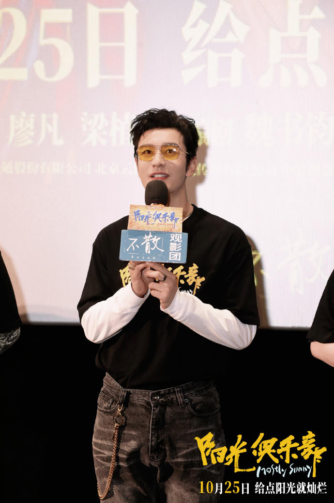 那天,他穿着印有电影片名的黑色T恤,戴着一副明黄色镜片的潮流眼镜,与电影中的角色判若两人。