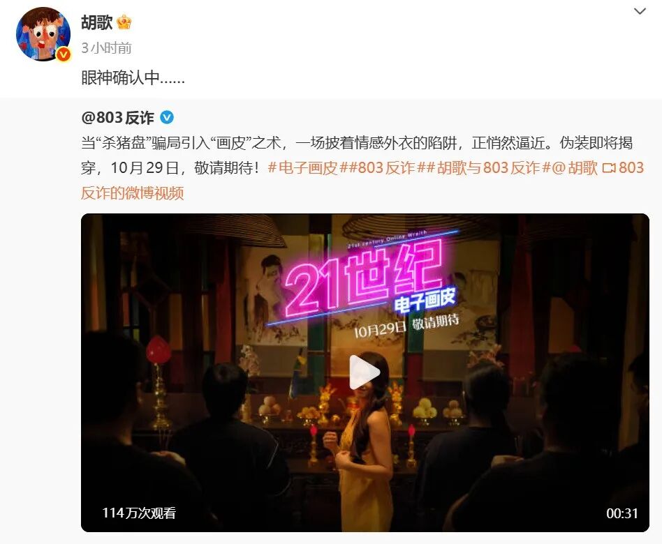 10月27日,上海市公安局发布反诈主题微电影《 21 世纪电子画皮》的预告。