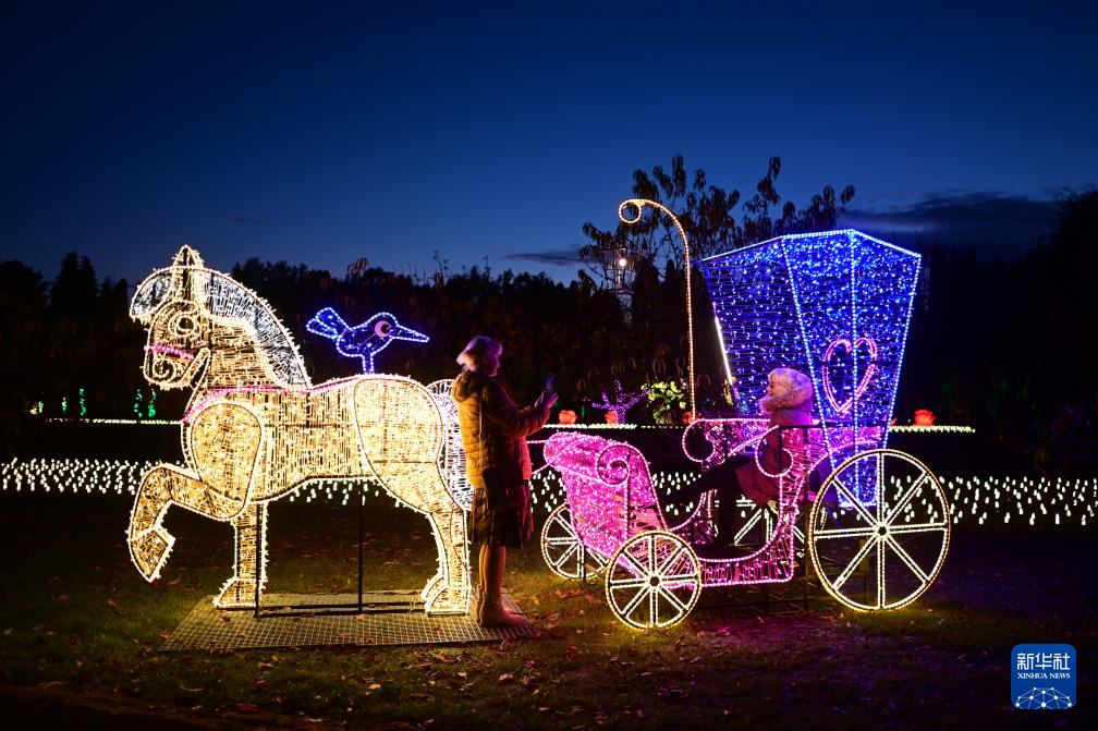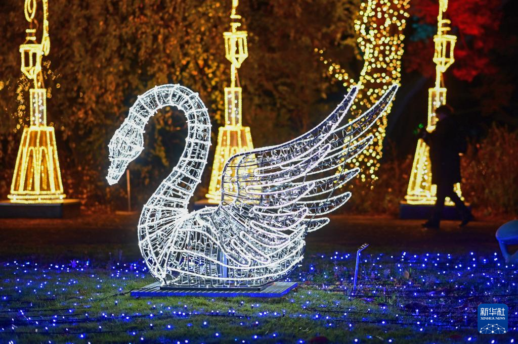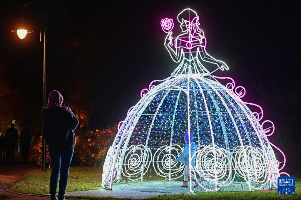 这是10月25日在波兰华沙市郊的波兰科学院植物园“光之花园”灯光展上拍摄的彩灯造型。