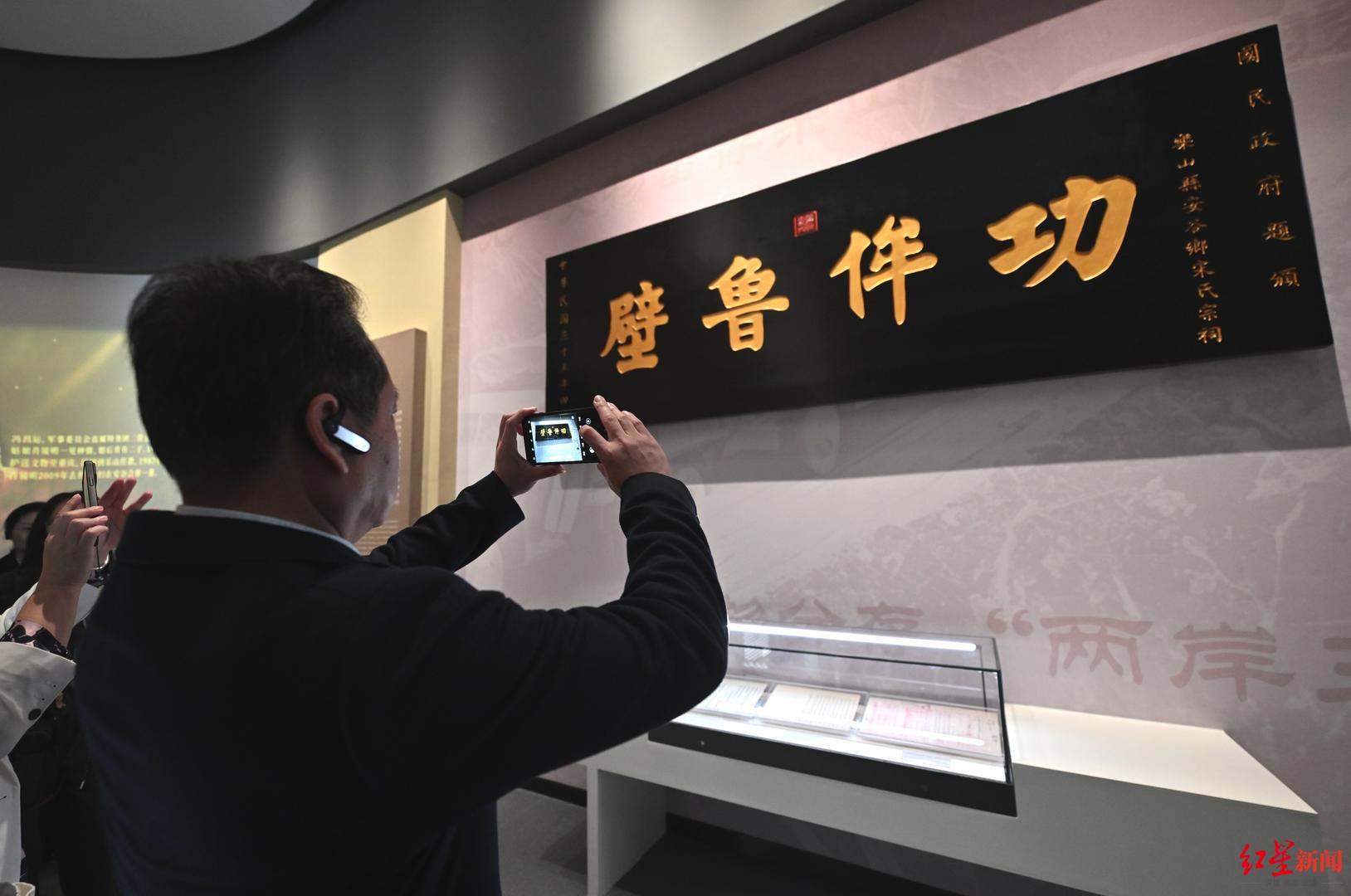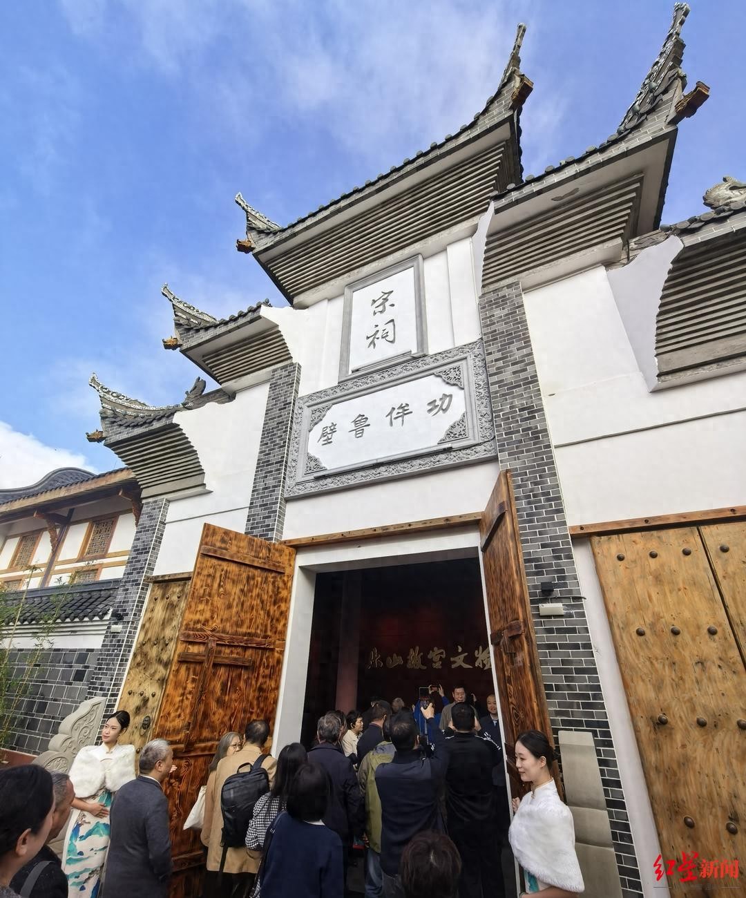 嘉宾在“功侔鲁壁”牌匾前拍照 图据乐山融媒