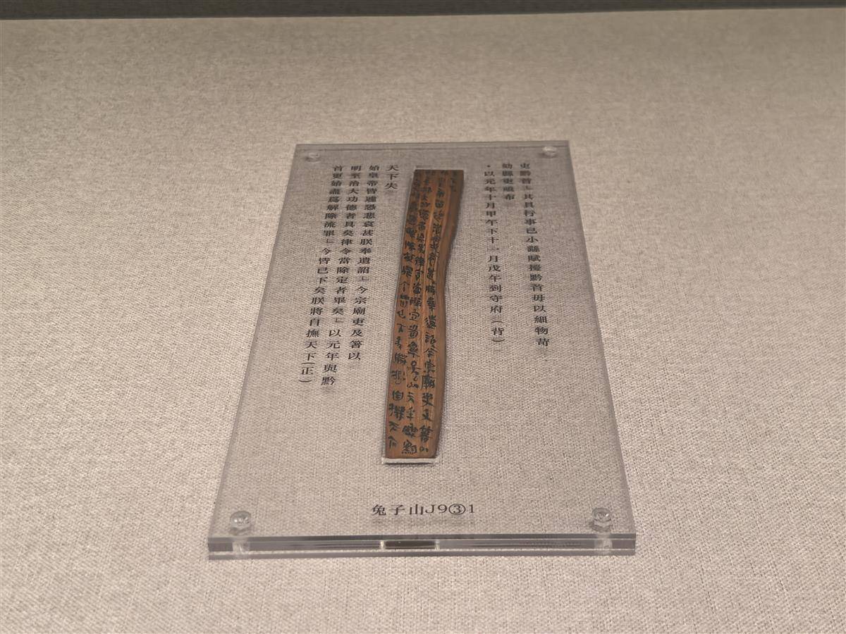 简牍是纸张普遍使用之前最重要的书写载体。从目前发现时代最早的曾侯乙墓竹简,到东晋末年,存续了千年之久。罗恰介绍,此次展出的甘肃武威旱滩坡19号晋墓前凉驸马都尉木牍,由甘肃简牍博物馆收藏,是上展展品中年代最晚的一件简牍文物,年代即为东晋末年。